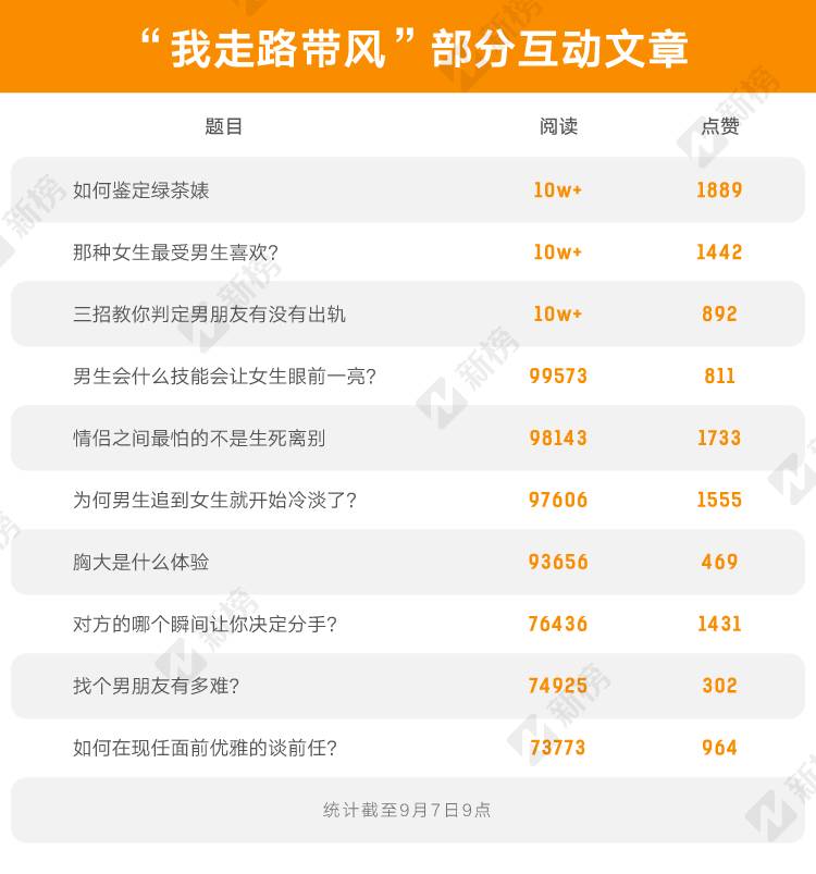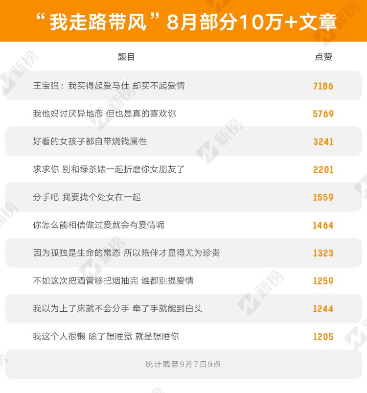 新榜采集的数据显示,整个8月份的31天中,“我走路带风”有30篇收获了10w+的阅读量。文章的主题基本围绕年轻人的恋爱观、金钱观、价值观展开,鲜明个性在题目中显露无遗,例如:《好看的女孩子自带烧钱属性》《只要还牵着你的手,我就会相信爱情》《你送的礼物太便宜了,我们分手吧》。