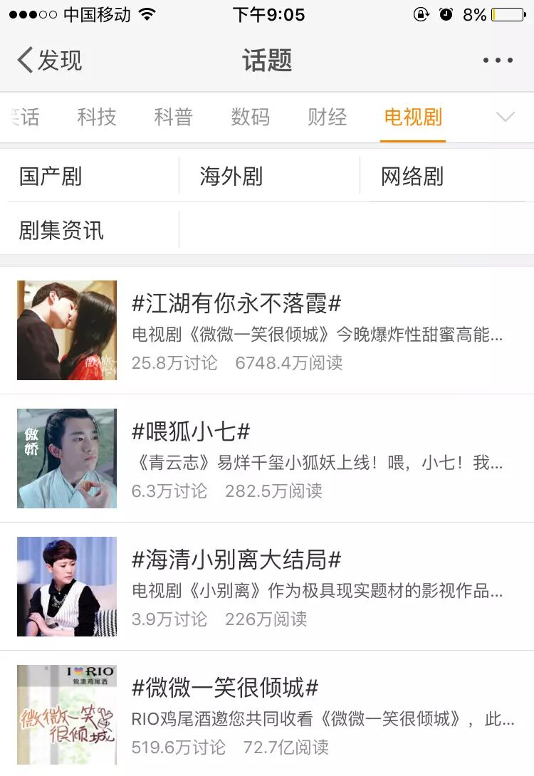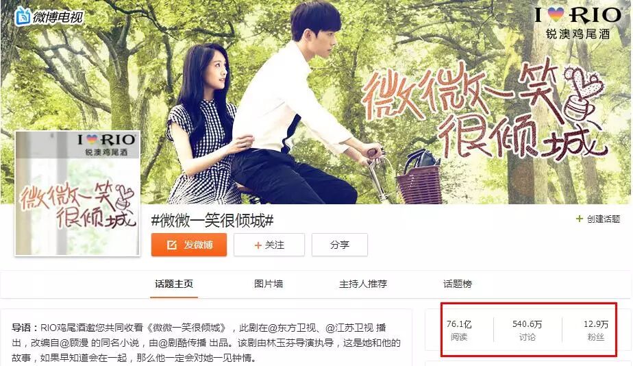 其中值得一提的是,阅读量75.8亿的微博话题就是由@由@电视剧微微一笑很倾城 发起,RIO鸡尾酒赞助的,6日整天有很长一段时间占据微博热搜前三。而昨晚《微微》大结局,电视剧放映期间,微博话题#江湖有你永不落霞#也登上热搜榜,网友自发纪念《微微》的happy ending。