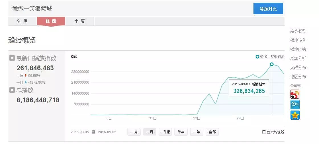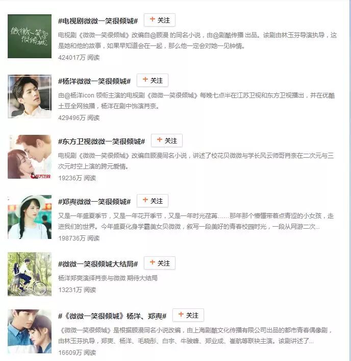 8月22日开始,《微微》相关话题成为微博热搜常客,截止到9月7日下午2点,粗略统计共产生微博热搜话题217个,阅读量前三的话题分别是#微微一笑很倾城#75.8亿、#电视剧微微一笑很倾城# 42.5亿、#杨洋微微一笑很倾城#52.8亿,总阅读量超过171.1亿。除此以外,其他微博话题中,阅读量过亿的还有4个,阅读量过百万的很多。