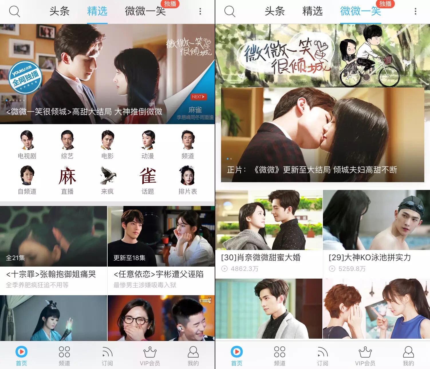 电视剧《微微》2家电视台首播,1家电视台跟播,线上的播放权只优酷一家。视频平台的独播权给了优酷,优酷自然也拿出了优势资源,推这部大热的青春剧。优酷网站的顶部banner推广、漂浮窗、热搜关键字等,优酷App不但在滚动屏推荐,还特意开了“微微一笑”专栏页面,首页顶部清晰可见。一打开优酷,就能看到《微微》,这也难怪能轻松卷走81.8亿播放量。