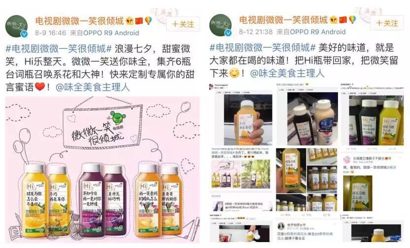 “买了味全每日C为剧版《微微一笑很倾城》出的限定包装[羞嗒嗒]还贴心地注明【电视剧】,没搜集全,以后在各家店里慢慢寻找。”作为《微微》电视剧的饮料合作商,剧中的植入虽然简单粗暴,但剧外的借势营销却玩得酥麻。