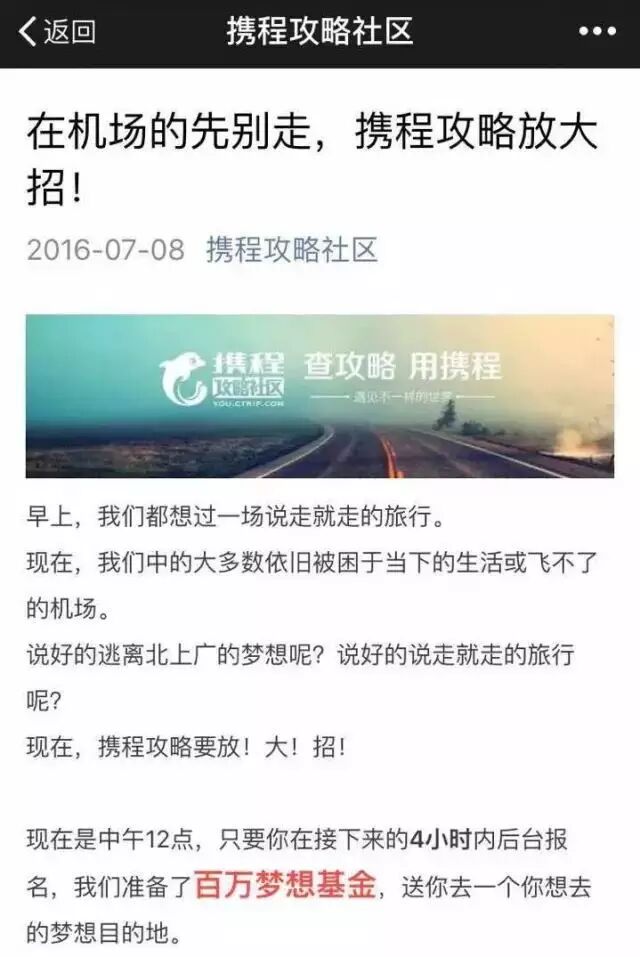 携程瞄准的,正是那些上午想逃离却没逃离成功的人,公众号“携程攻略社区”在当天中午12点推文,表示要“放大招”,“只要你在接下来的4小时内后台报名,携程准备了百万梦想基金,送你去一个你想去的梦想目的地。”