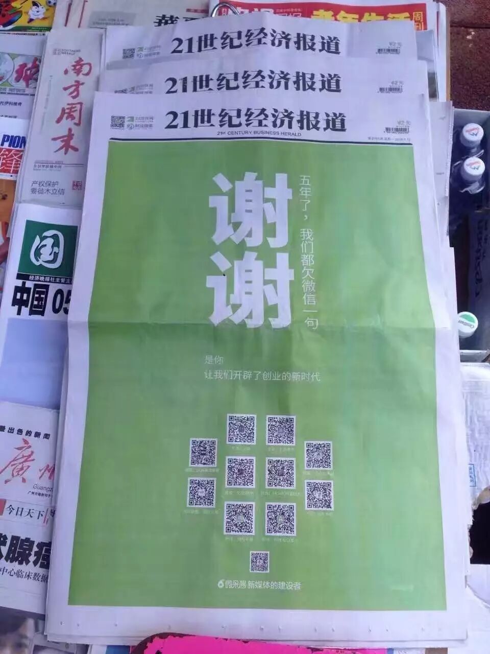 9月12日一早,96万份头版印有“谢谢体”的《二十一世纪经济报道》被分发到各个报摊点、书店。该头版几个字 “五年了,我们都欠微信一句谢谢”占据了二分之一的版面,正下方则是该公众号的二维码。二维码下方有一行小字“是你,让我们开创创业的新时代”。