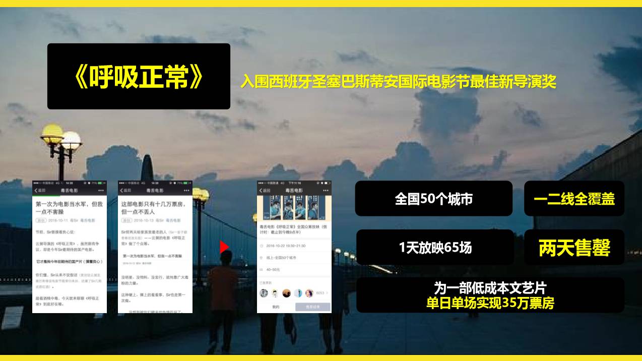 后来我们又尝试了一个更有意思的事情——众筹放映,做了《呼吸正常》这个片子。在50个城市放了65场,帮一部没有机会在院线上映的艺术片,实现了35万票房,7000多人参与,这是真正来自影迷的高端院线,全新的电影发行模式。我们也做了一个影业公司,希望可以实现颠覆、孵化以及反向定制的。