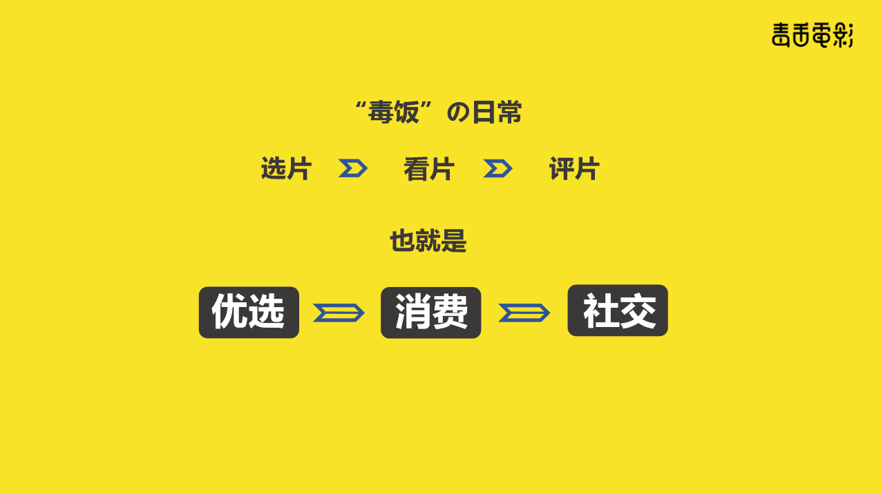 此外他们看电影的频率非常高,每周至少看一次片,每个月一到两次电影院,这个频率比大姨妈还要频繁。他们的日常是什么呢?选片,看片,评片。这其实是很正常的一个电商轨迹,我让你优选,然后我去消费,我还要在这之前进行一个兴趣社交。
