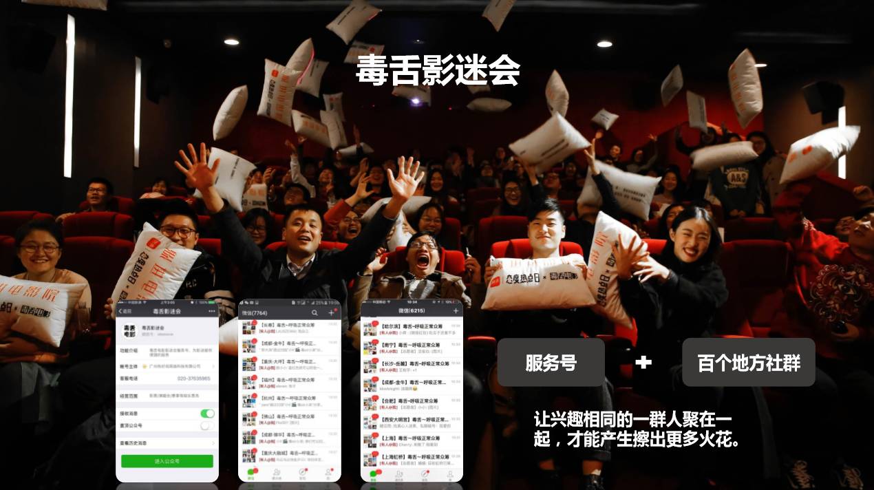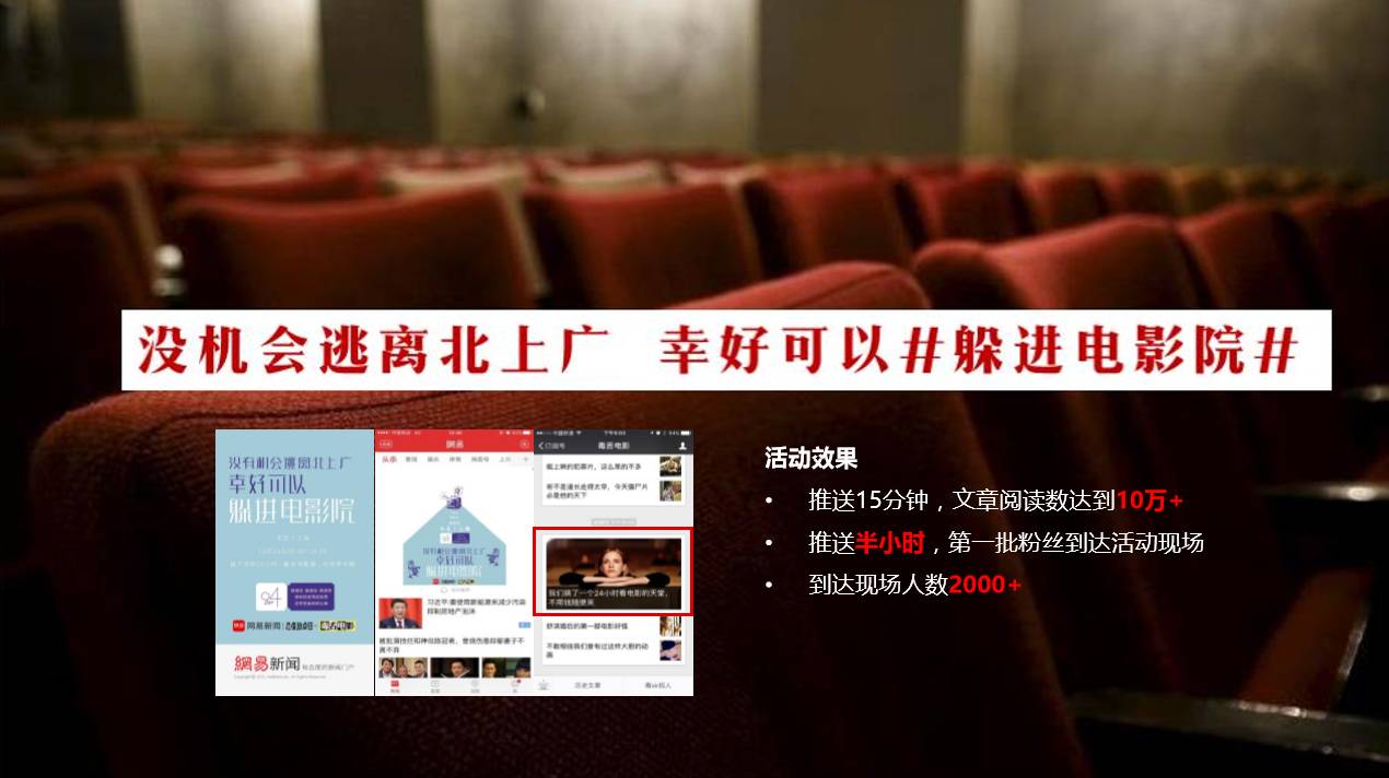 另外我们还做了24小时影院,跟网易一起做的。文章推送15分钟之后就达到10w+,我们是晚上11点推送的,有姑娘湿着头发就到了现场,说刚洗完头,头发都来不及吹就来了。70人的影厅,到达现场的陆陆续续有2000人。我们也做了自己的影迷会。