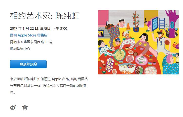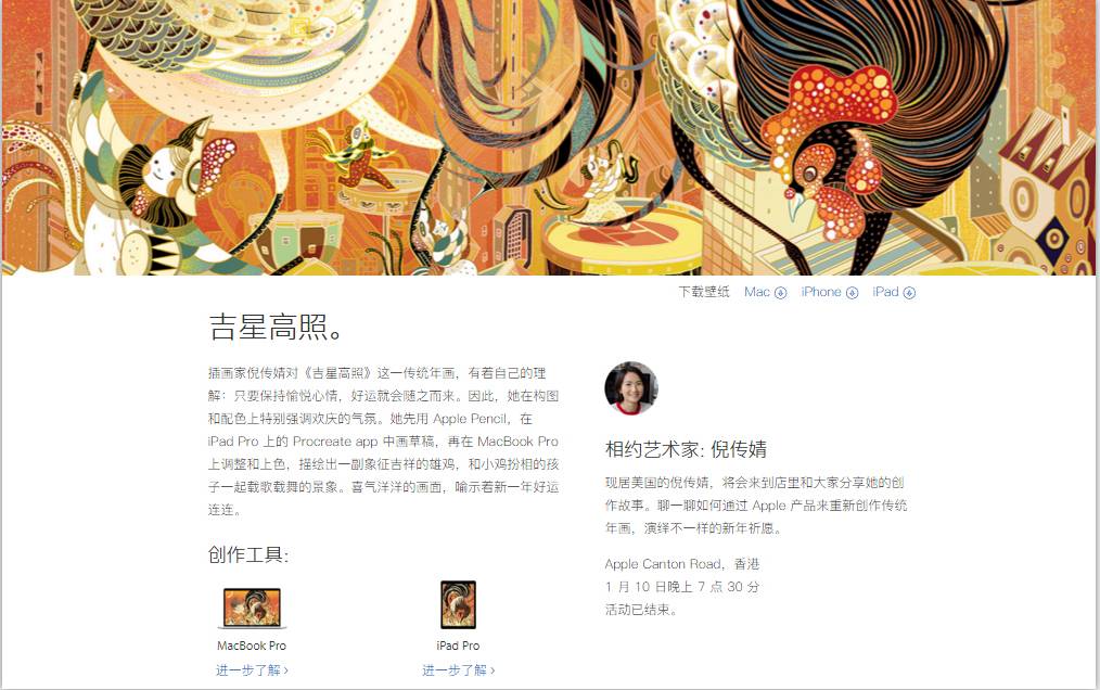 值得一提的是,每个中国艺术家还会配合各个地区的苹果体验店举行线下活动。例如绘制“阖家团圆”年画的陈纯虹会在1月22日下午3点,于昆明Apple Store零售店和大家讲述她自己运用Apple产品画画的心得。另外、香港、上海、广州、天津四个地区的苹果零售店也会有艺术家做线下分享沙龙。
