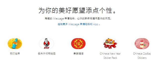 官网显示,苹果推荐了5款个性 iMessage贴纸给用户,分别是苏打世界、老夫子付费贴图、最萌福语、Chinese New Year Sticker Pack、Chinese Zodiac Stickers。这5款表情贴纸都有非常鲜明的中国元素,例如长袍夫子、福字、十二生肖等。看起来似乎很适合大家节日发表情斗图。但是多少人和榜妹一样,早就被微信彻底绑架,并不常用iMessage。
