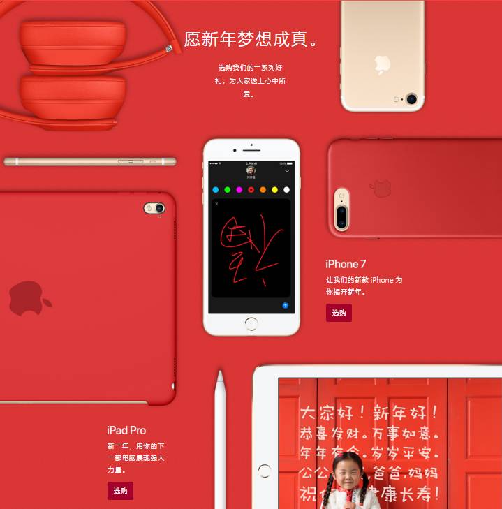 苹果增加了红色的iPhone 7皮革手机套、iPad Air平板套、38毫米运动型腕表带,金色的Beats Solo3 Wireless头戴式耳机,以及价值398元的设计师定制款农历新年手机壳(绝对中国风)。
