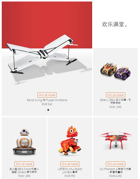 除了一系列的手机和iPad的周边,苹果还上线了一系列科技玩具产品,配色也是红艳艳的喜庆,例如:Galaxy ZEGA战斗玩具、战斗型BB-8 Droid 机器人搭配Sphero 原力手环、DJI Phantom 4航拍飞行器新春限量款……共计5款产品。