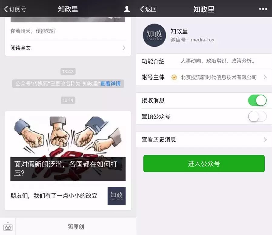 新榜讯 1月17日,搜狐旗下公众号“传媒狐”改名为“知政里”。简介也由之前的“搜狐传媒提供快速、全面媒体业内动态,解析传媒行业趋势,汇聚传媒领军人物、专家学者智慧观点,打造传媒专业领域高端影响力平台。”改为现在的“人事动向、政治常识、政策分析。”