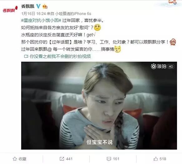 香飘飘的短片在《春节自救指南》前一天发布,只获得小范围的关注。虽然只是59秒的视频,但对女主春节力战众亲戚的描写很深刻。