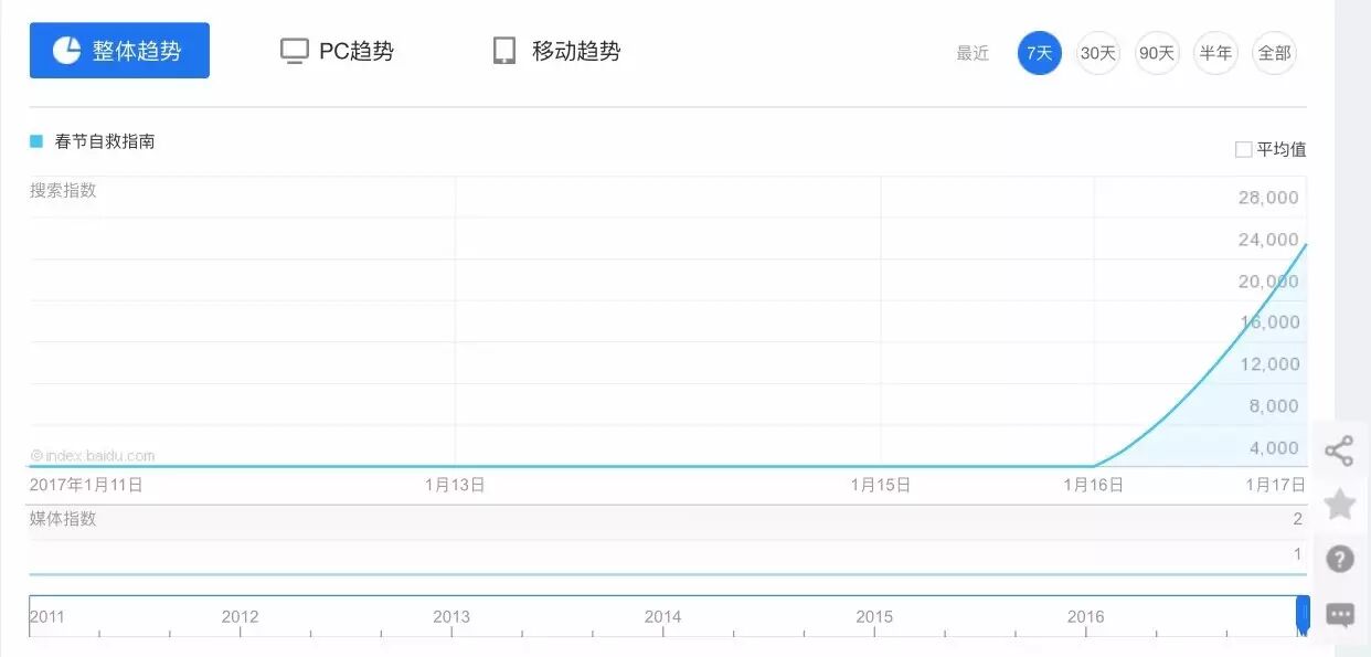 从百度全网的媒体指数来看,这个视频的爆火趋势更明显,16日之前(包含16日),“春节自救指南”等相关关键词的指数为0,17日骤然上升至21532。