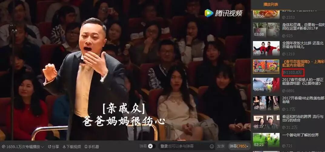 即使这样,这个视频的传播也绝对能称得上名副其实的“刷屏”。刨除微博传播以及其他网友扒视频重新上传,仅彩虹室内合唱团官方在腾讯视频网站上传的视频,两日不到,播放量已经超过1102万。