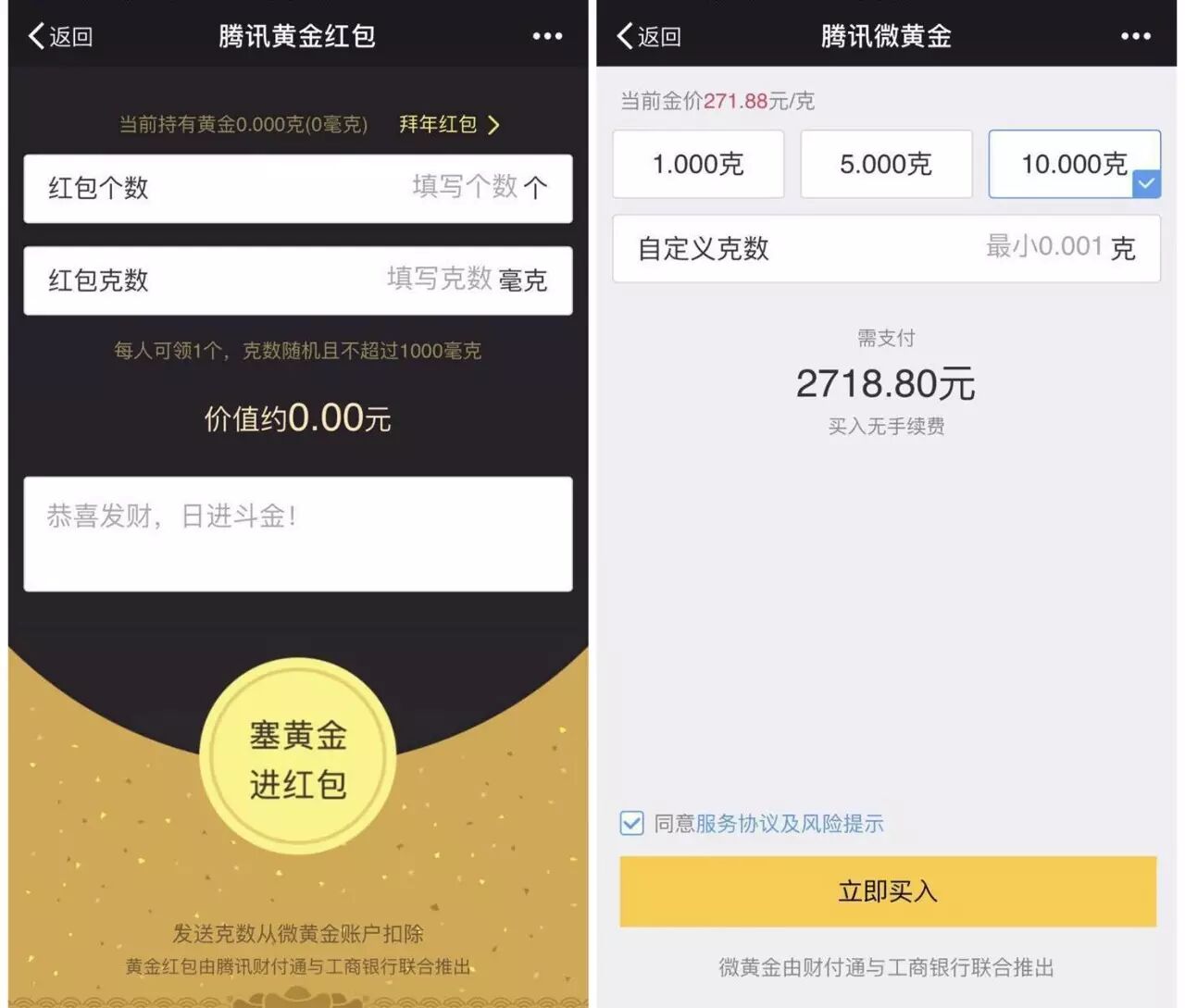 用户可以将本人持有的黄金份额以红包的形式转让给亲友,形式表现为“黄金红包”。抢到的黄金红包中会包含0.001克至1克不等的微黄金份额,相当于用户以当时的金价获得黄金。