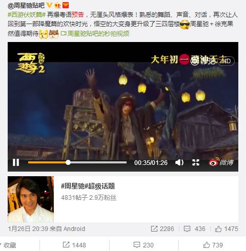 1月25日,周星驰徐克《西游伏妖篇》再爆粤语预告,主题:无厘头