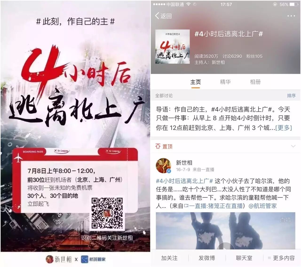 新榜:说到送机票想起“逃离北上广”,哈哈,朋友圈有人开玩笑说新世相是买了个航空公司吗。