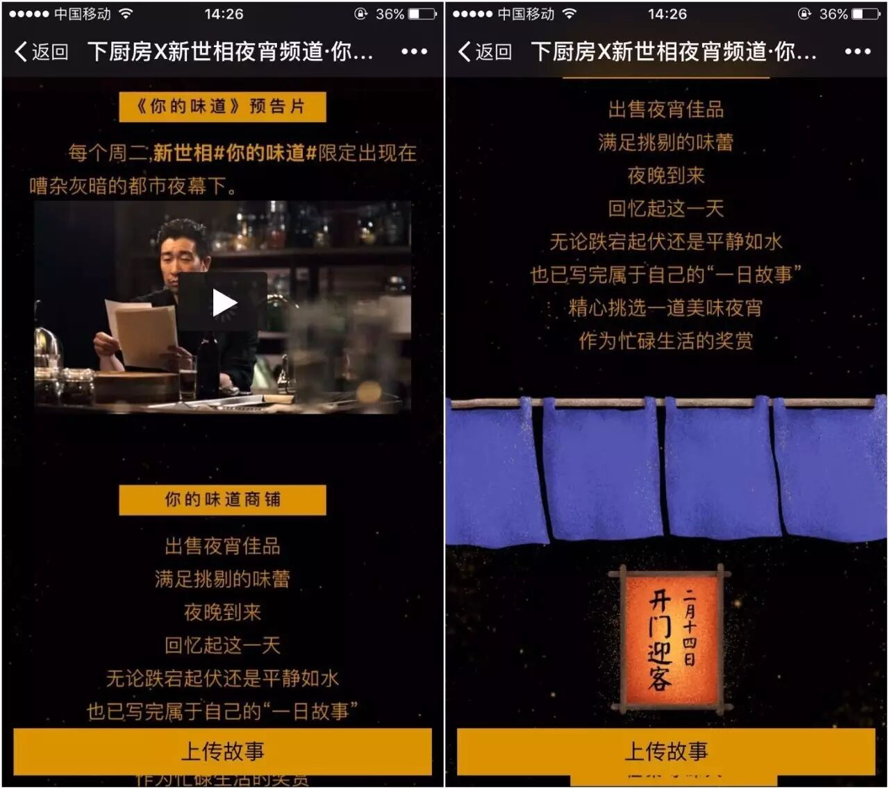 此外,“新世相”还与梨视频合作推出“你的味道”订阅号;与开眼合作,定制深夜美食频道,定期推出《你的味道》。