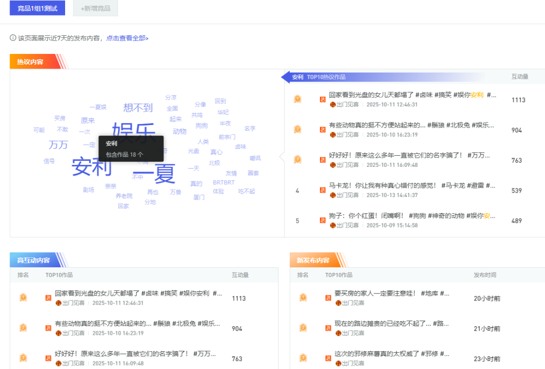 通过矩阵通「竞对监测」,该台实现了对其他同领域媒体账号的动态追踪与内容监测,一屏展现高互动作品、新发布作品及热议内容词云,支持作品查看,全面掌握同行动向。