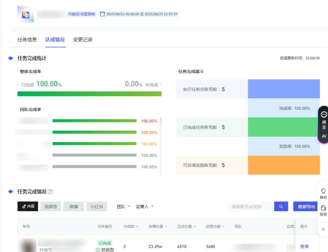 任务结束后,系统自动生成结案报告,涵盖完成率、作品数量、互动数据等关键指标,并附账号完成质量排名。