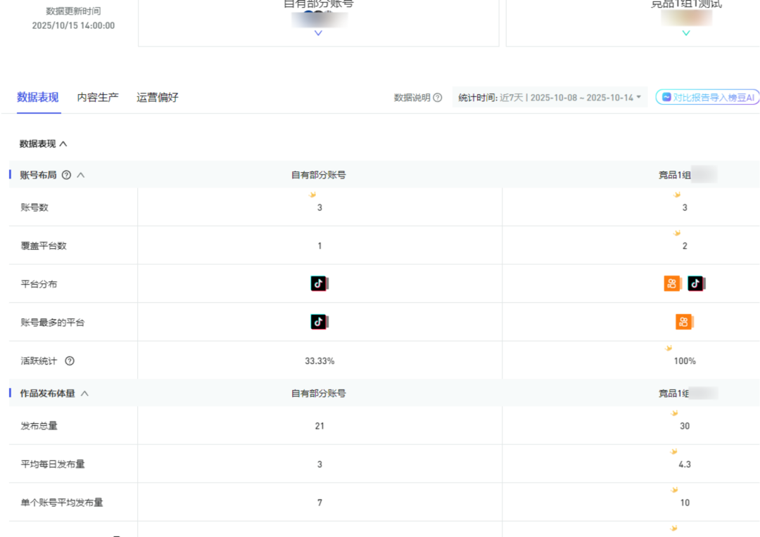此外,该台还针对性创建两组竞品组,将自有账号与同类账号在作品量、传播量、互动量等多维度进行数据化比对,清晰量化变现差异。