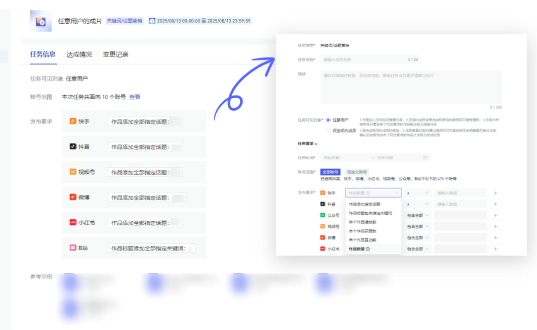 现在,借助矩阵通「任务派发」功能,该机构为不同团队及账号设定个性化考核目标,如“1月内作品发布数量≥20”、“作品传播量≥1000”。系统自动追踪发布进度与互动表现,任务看板实时展示团队完成度与账号执行明细。