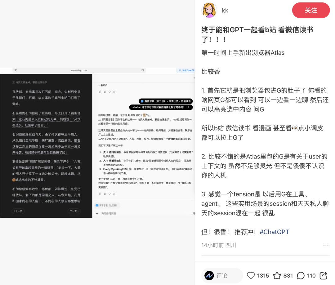 你在ChatGPT里保存的个人信息、偏好、设定的ChatGPT回复风格,都会延续到Atlas。