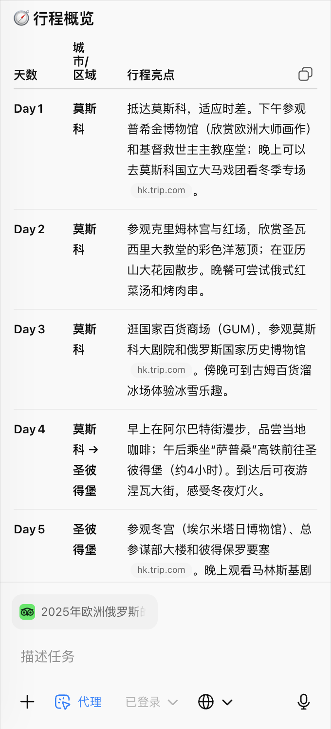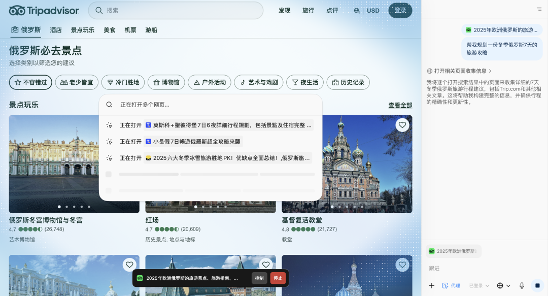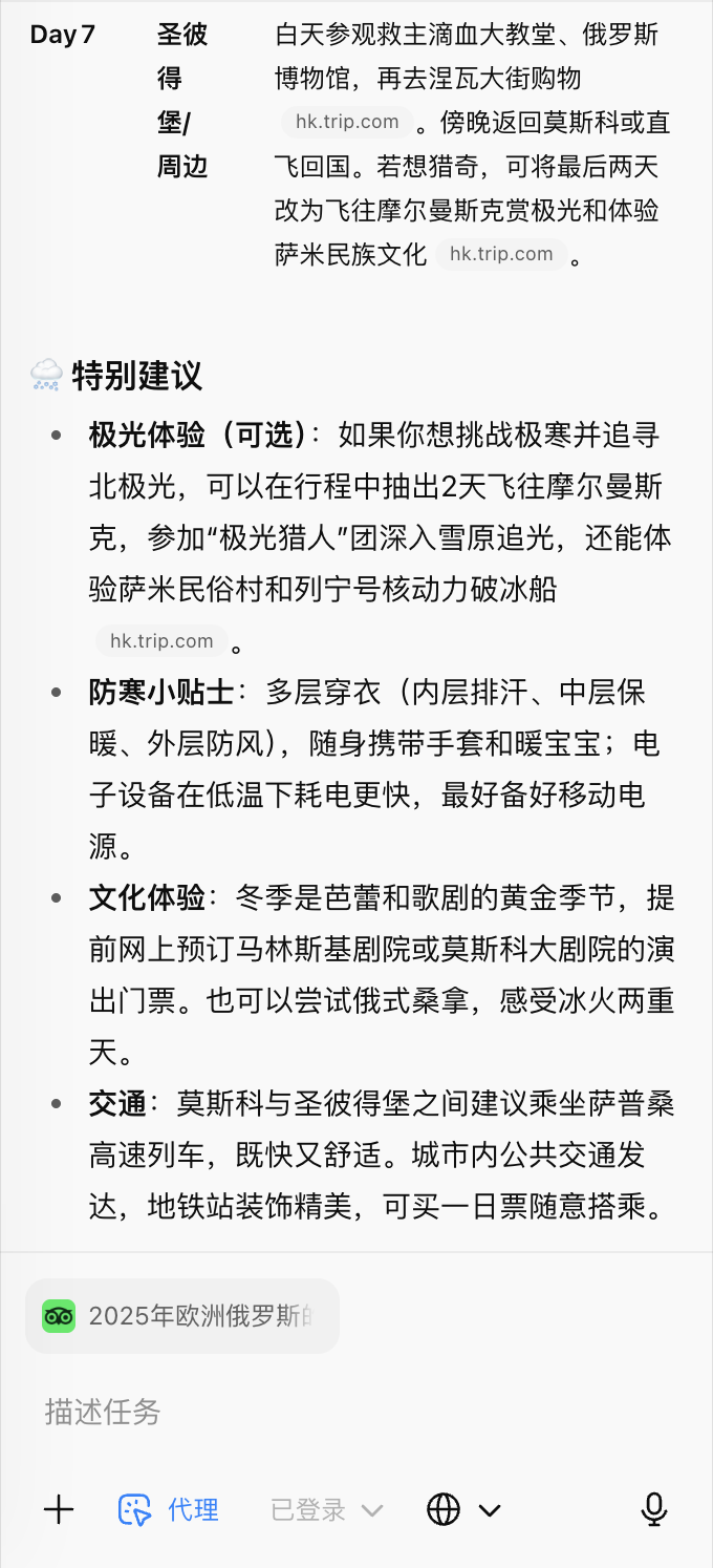 比如,我在Tripadvisor网站浏览俄罗斯景点时,开启代理模式让ChatGPT帮我做一份俄罗斯冬季旅游攻略,不到3分钟,Atlas就生成了一份详细的7日行程概览。