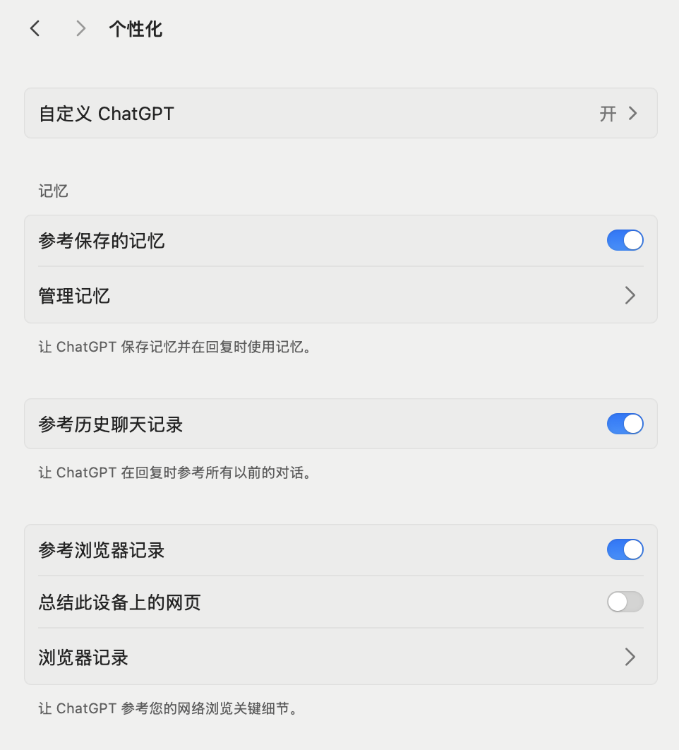 Atlas能记住你的浏览历史和偏好,从而提供更个性化的建议和服务。你可以随时查看、更改或删除这些记忆。在Atlas的个性化设置中,可以看到其记忆是和ChatGPT账号完全打通的。