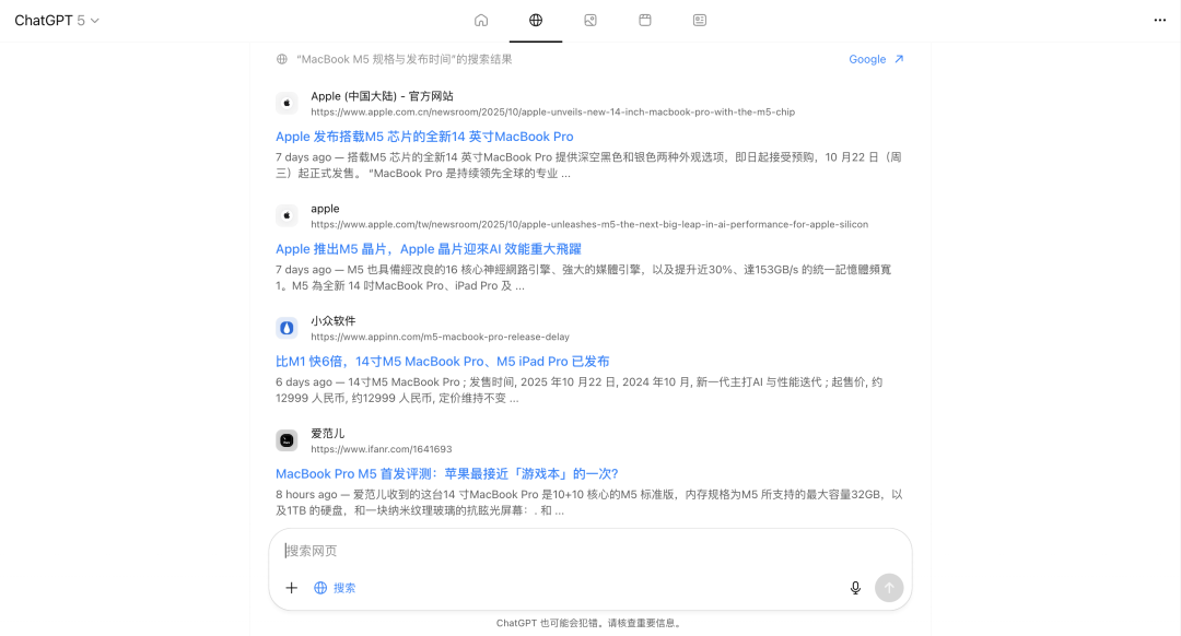 当我在输入框输入“MacBook M5规格与发布时间”按回车后,默认先出现的是ChatGPT的问答界面,你可以在顶部栏切换传统搜索,包括搜索、图片、视频、新闻。