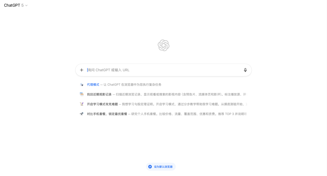 Atlas的界面延续了ChatGPT Web端的风格:一个居中放置的输入框,和几个用法示例,只不过输入框除了问ChatGPT外,还支持Google搜索。