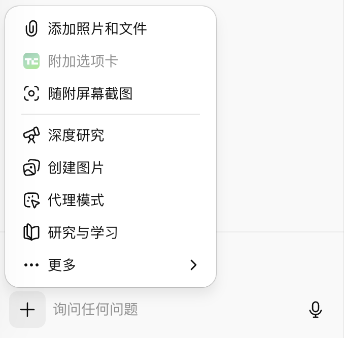 而且,点击侧边栏的“+”图标,会发现它几乎复刻了ChatGPT的所有核心能力,包括上传照片、文件,或者截取屏幕进行提问,而且支持深度研究、创建图片、代理模式等功能。(感觉可以把Mac上的ChatGPT客户端卸载了)