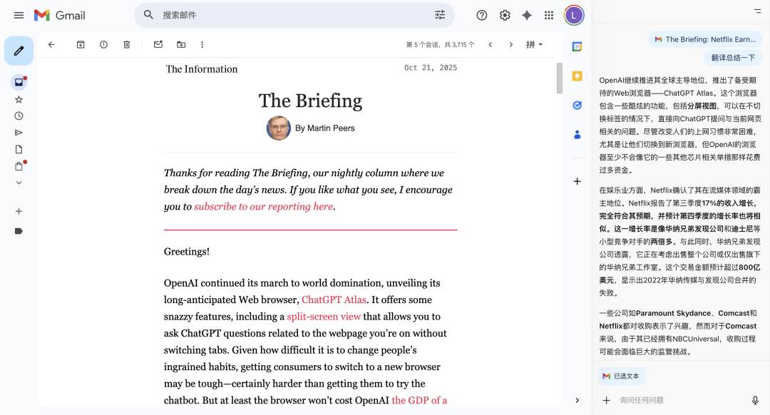 现在,只要在Gmail中打开对应的Newsletter,点击浏览器右上角的“Ask ChatGPT(询问ChatGPT)”图标,就可以调出侧边栏,让ChatGPT进行翻译和总结,感觉可以大大提高Newsletter的利用率。