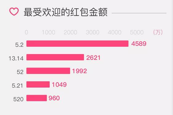 最受欢迎的表白红包金额为5.2元,共发出了4589万。令人羡慕的是,昨天,海口市的一位女用户收到的表白红包最多,有413个。