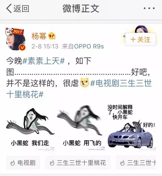 近期,演员杨幂在微博上推送自制表情包,为自己主演的电视剧《三生三世十里桃花》造势,将皮皮虾换成了剧中角色小黑蛇。