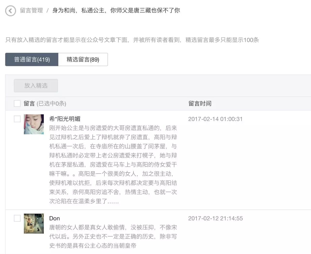 通过新榜公众号回采,分析完所有253篇文章后,我们发现“bookface”56.6%的推文,精选评论数达50条以上。吴蔚说,“bookface”运营两三个月以后,“上墙率”基本在1/5以下了。