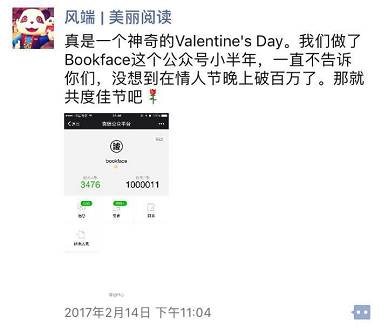 2月14日晚,当弥漫着罗曼蒂克气息的朋友圈,逐渐沦为情人节图片秀场的时候,吴蔚也适时晒出属于自己的小幸福——“真是一个神奇的Valentine's Day。我们做了Bookface这个公众号小半年,一直不告诉你们,没想到在情人节晚上破百万了。那就共度佳节吧。”