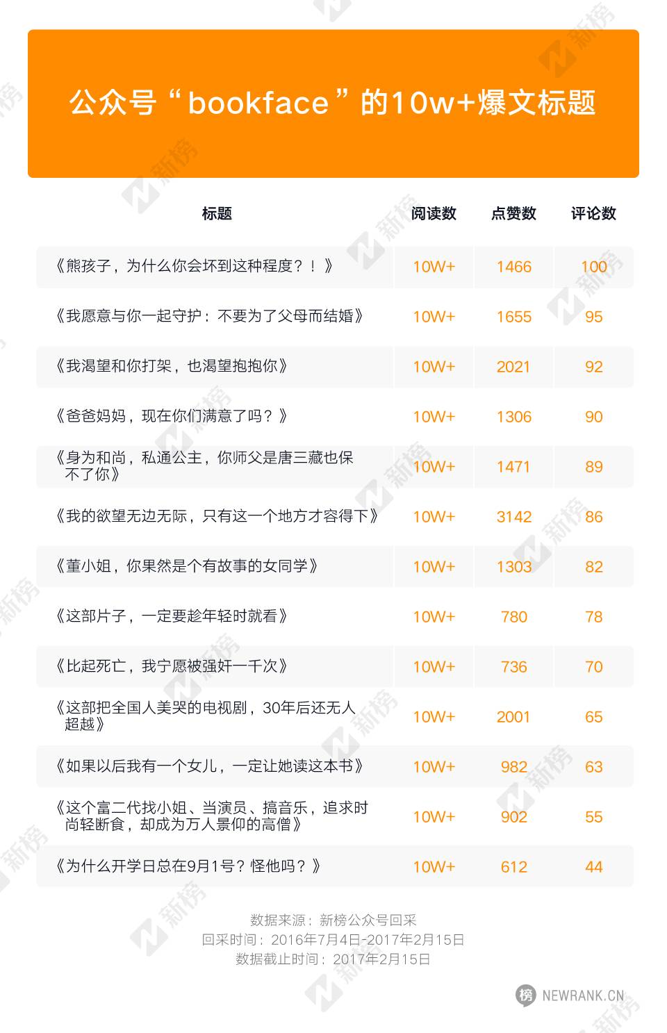 此外,我们还发现了一个有意思的现象,相比目前公众号文章约在千分之五左右的点赞率,“bookface”的文末点赞要高得多,差不多是行业平均的三倍。