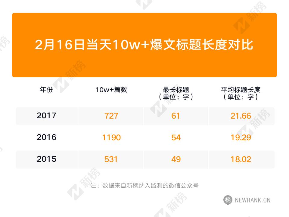我们利用新榜强大的数据功能,选择最近三年的同一天(2月16日),通过对当天10w+爆文标题的分析,观察那些最吸引用户打开的微信公众号是如何制作标题的:真的标题字数越来越长吗?标题制作有哪些特点?