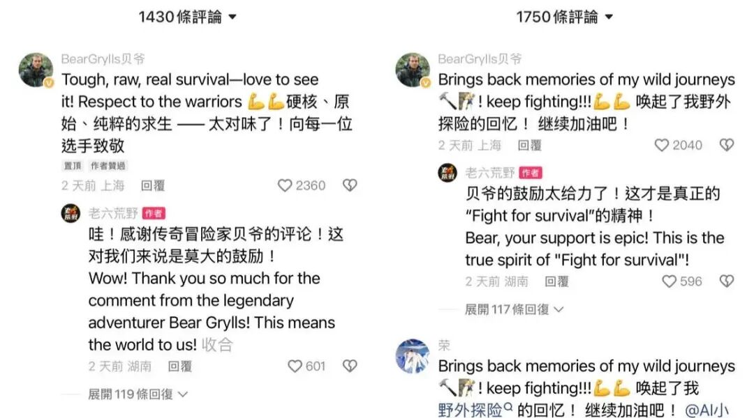 这场比赛还惊动了荒野求生元老级人物“贝爷”。赛事官方账号“老六荒野”在快手上更新的两集视频,均收到了贝爷漂洋过海而来的评论和点赞。