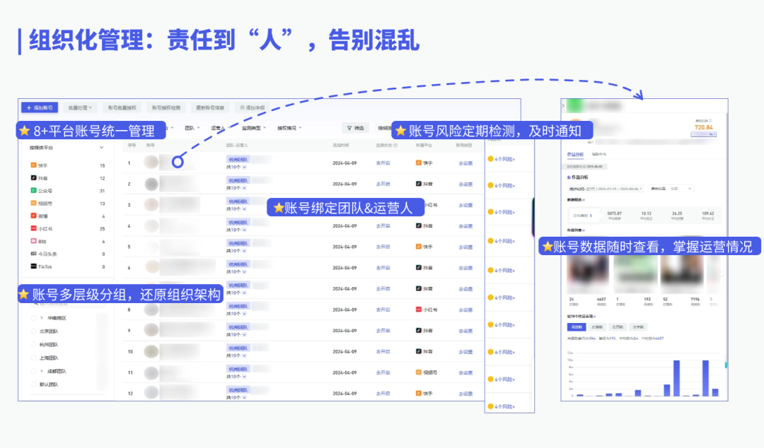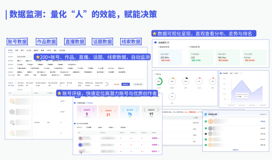 效能可视化:追踪账号及运营人员的关键指标,数据看板一目了然。