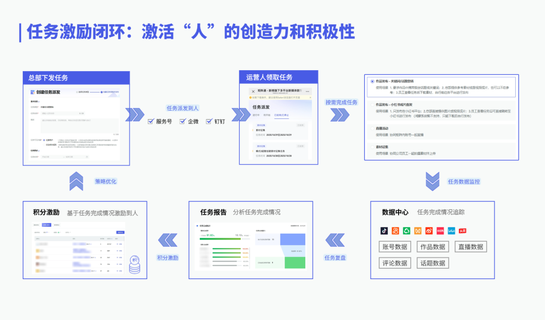 因此,我们围绕“账号背后的运营人”打造了一套完整的新媒体矩阵管理解决方案——以组织化、合规化管理为基石,提供高效创作工具降低门槛,通过任务+激励激发积极性,借助数据洞察指导策略,最终让归属感带来责任感,责任感催生创造力。(☞点击“申请体验”,即刻开启以人为本的新媒体矩阵管理)