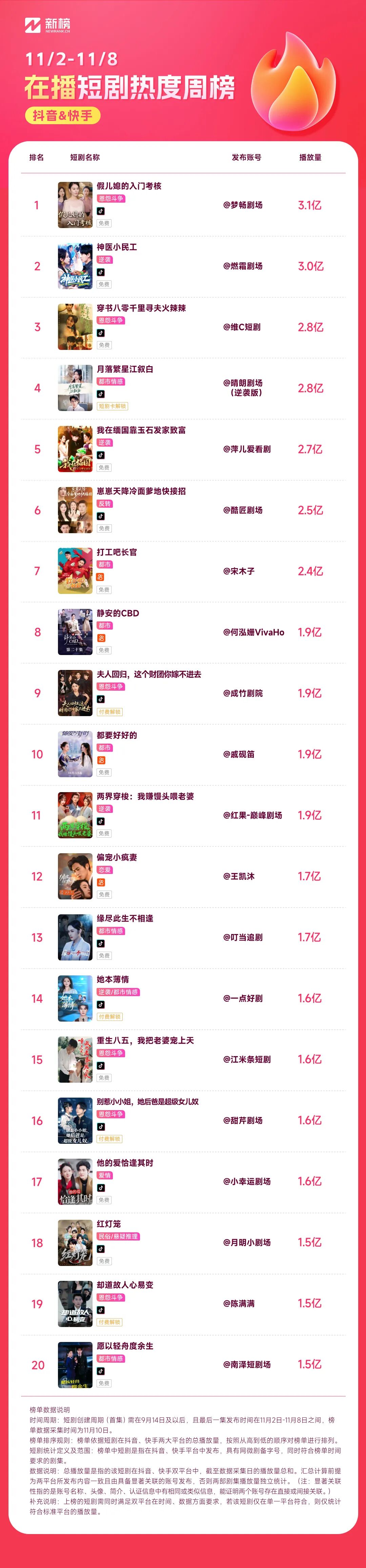 先来看看过去一周,抖音快手上都有哪些热门短剧吧!以下是依托新榜旗下抖音数据工具新抖、快手数据工具新快推出的“短剧周榜”,统计周期为2025年11月2日至2025年11月8日。