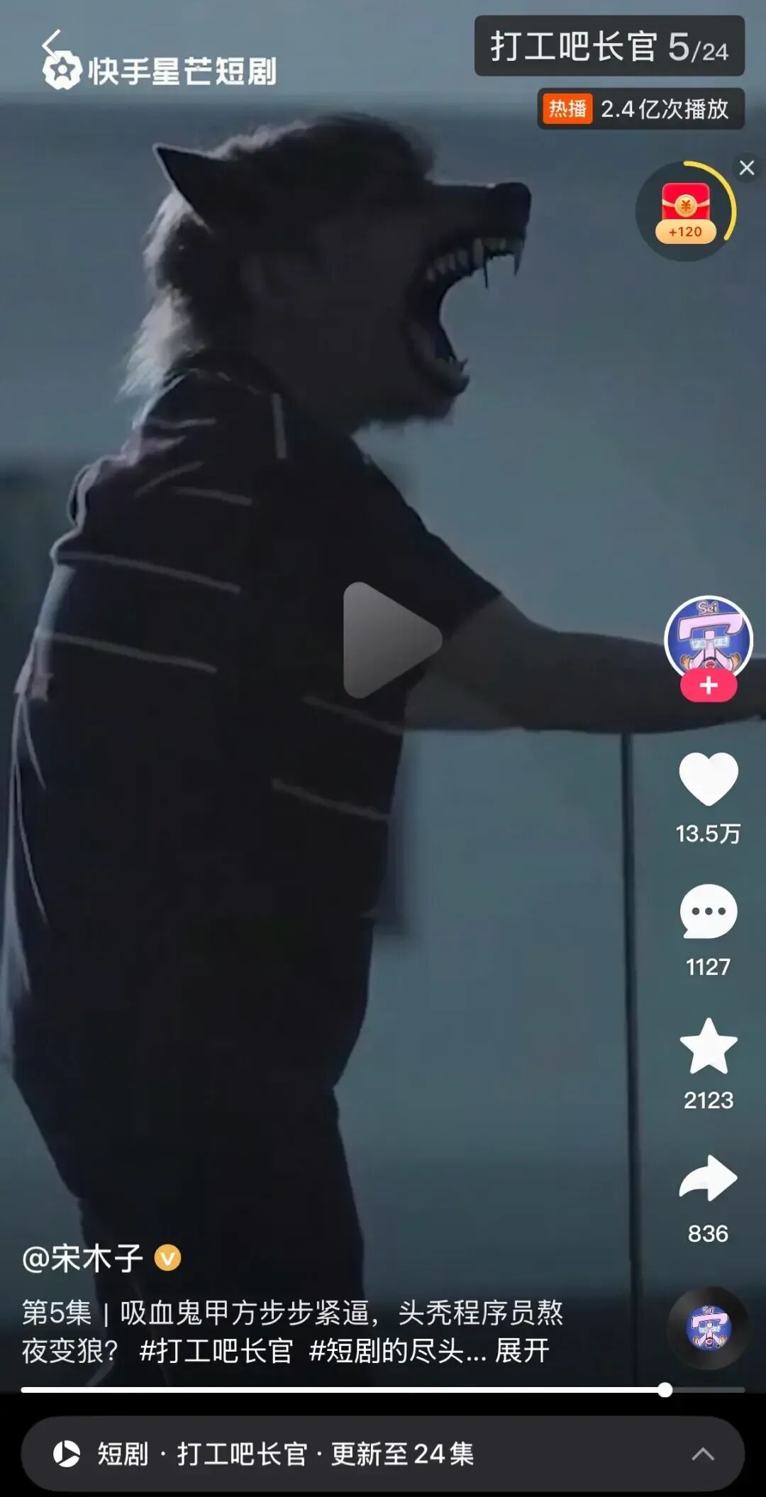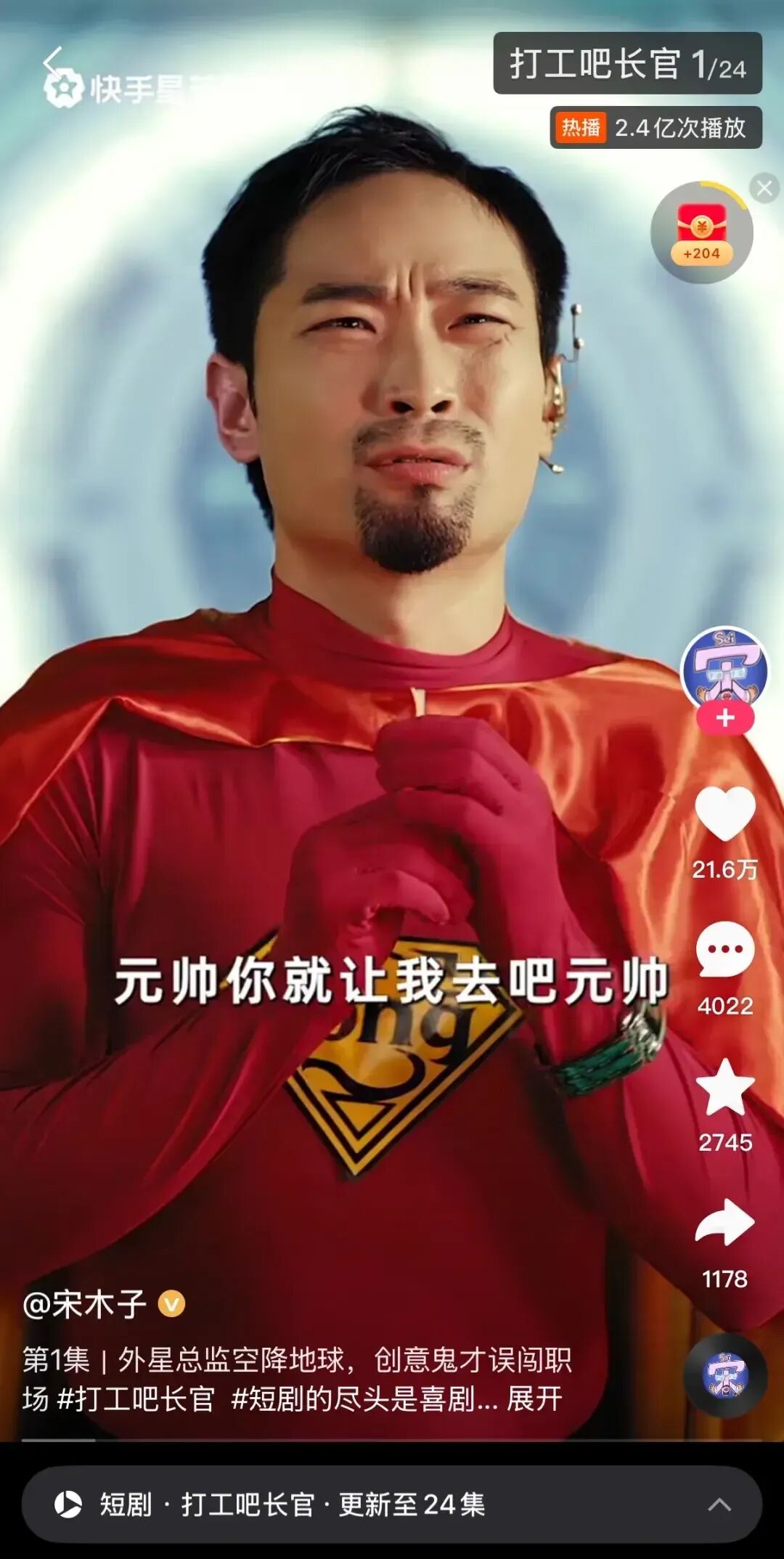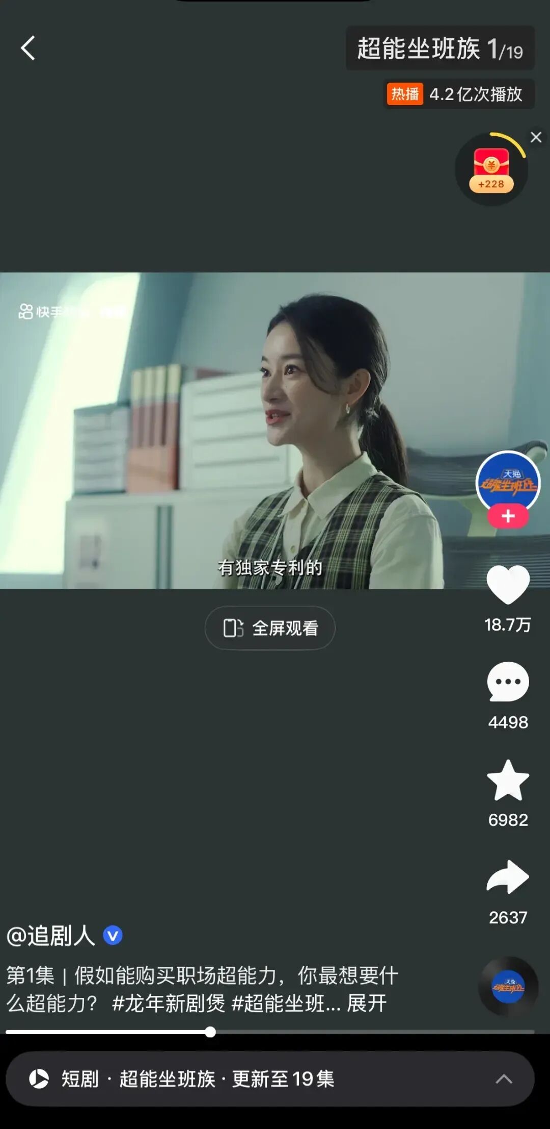 早在去年1月,快手就联合天猫推出了一部职场短剧《超能坐班族》,邀请知名演员郭晓婷和尹正主演,讲述打工人面对裁员等职业危机的故事,截至目前,在快手的累计播放量超4.2亿次。