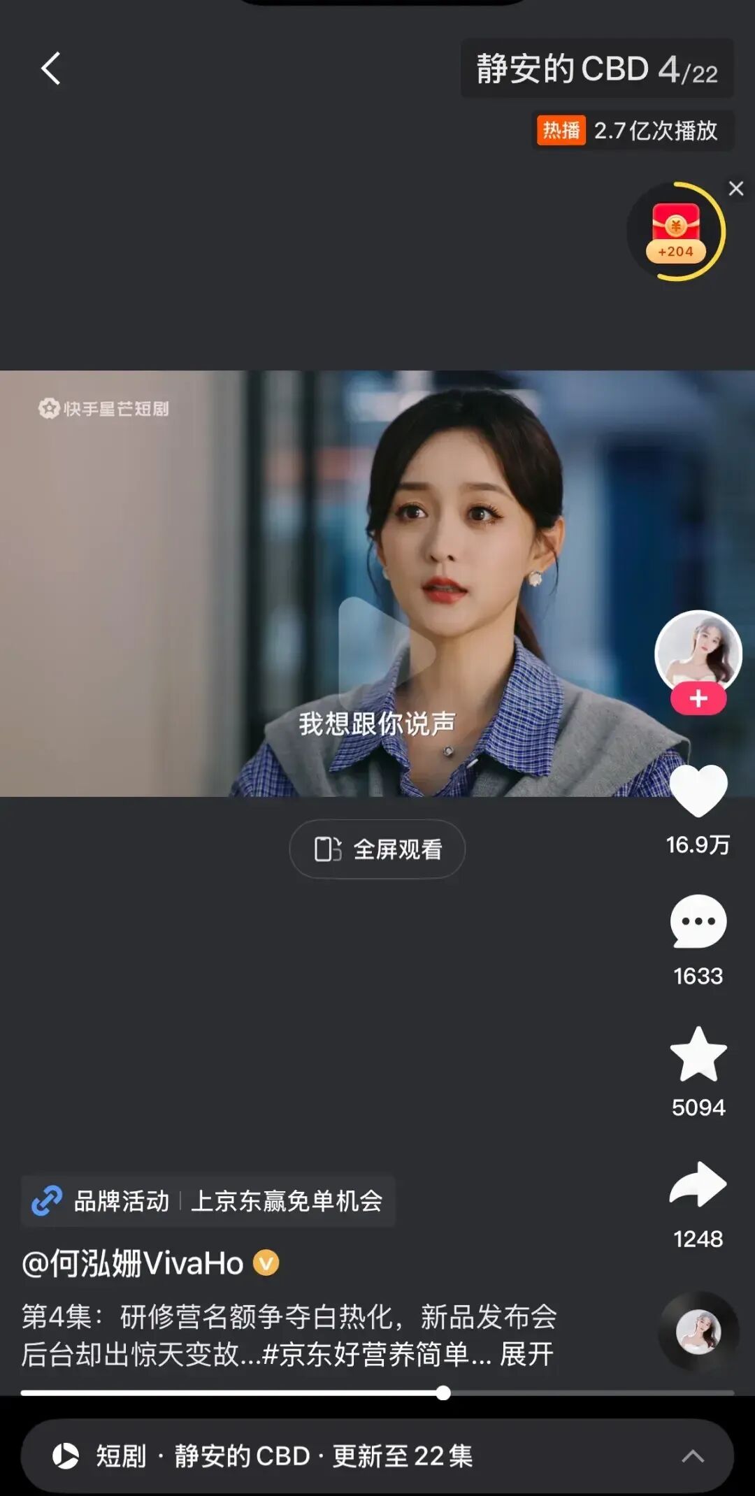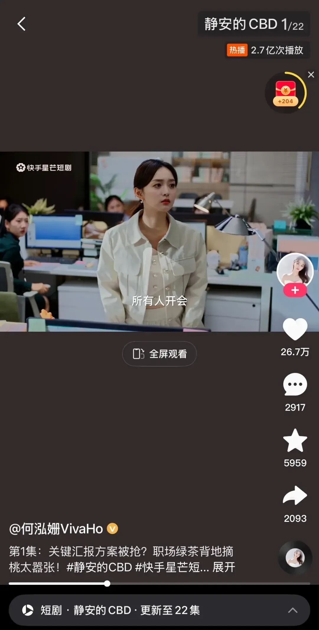 这周上榜的打工人短剧不只这一部,还有何泓姗主演的《静安的CBD》。