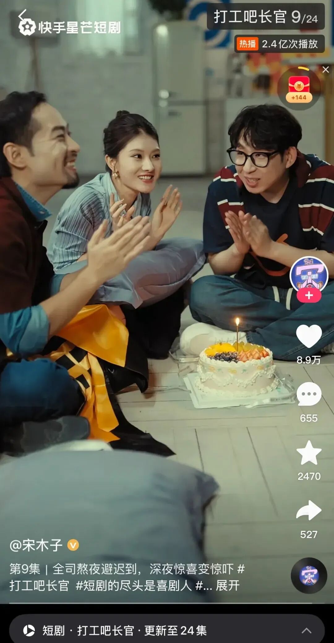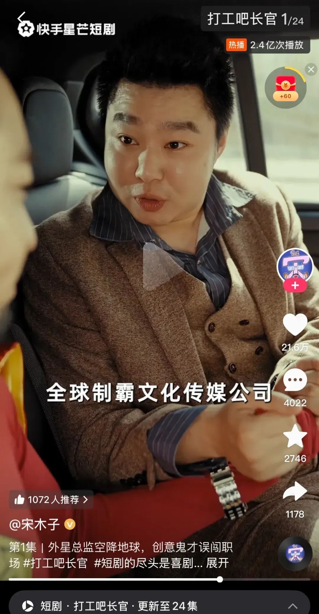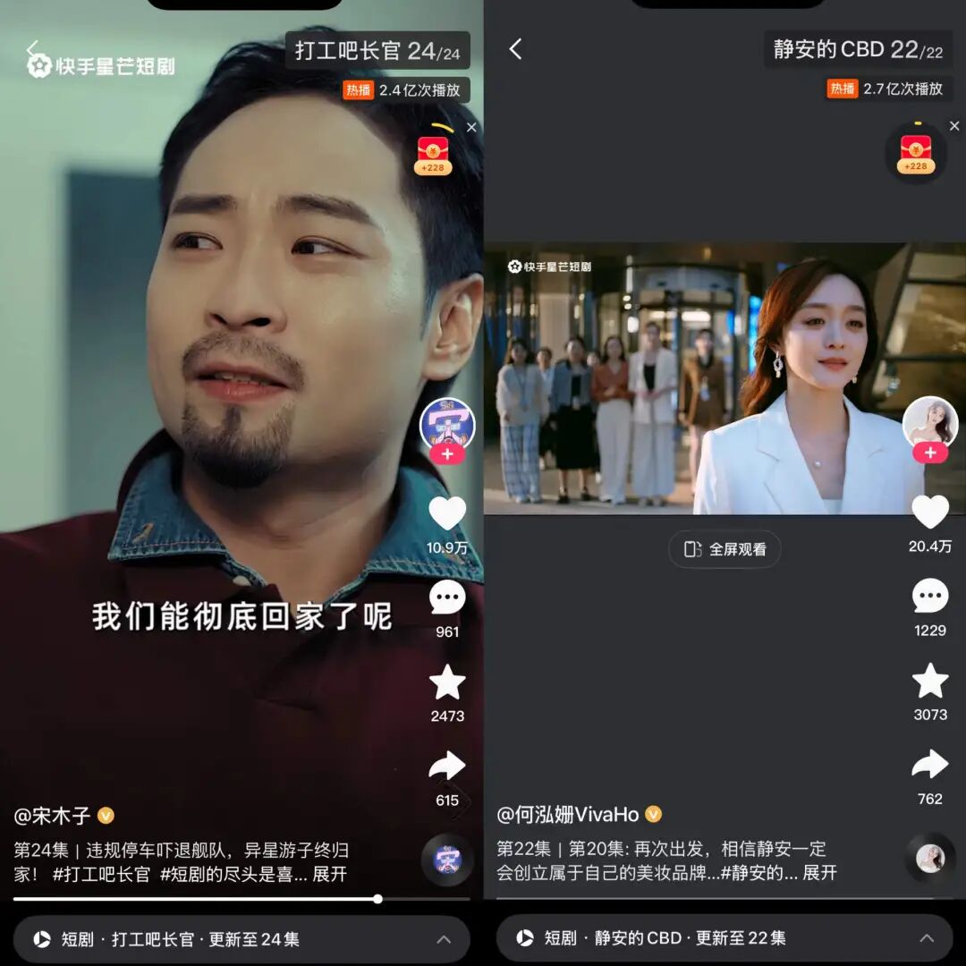 《打工吧长官》和《静安的CBD》两部短剧在快手的累计播放量超5.1亿次,不仅印证了职场题材的潜力,更俘获了一批年轻打工人。