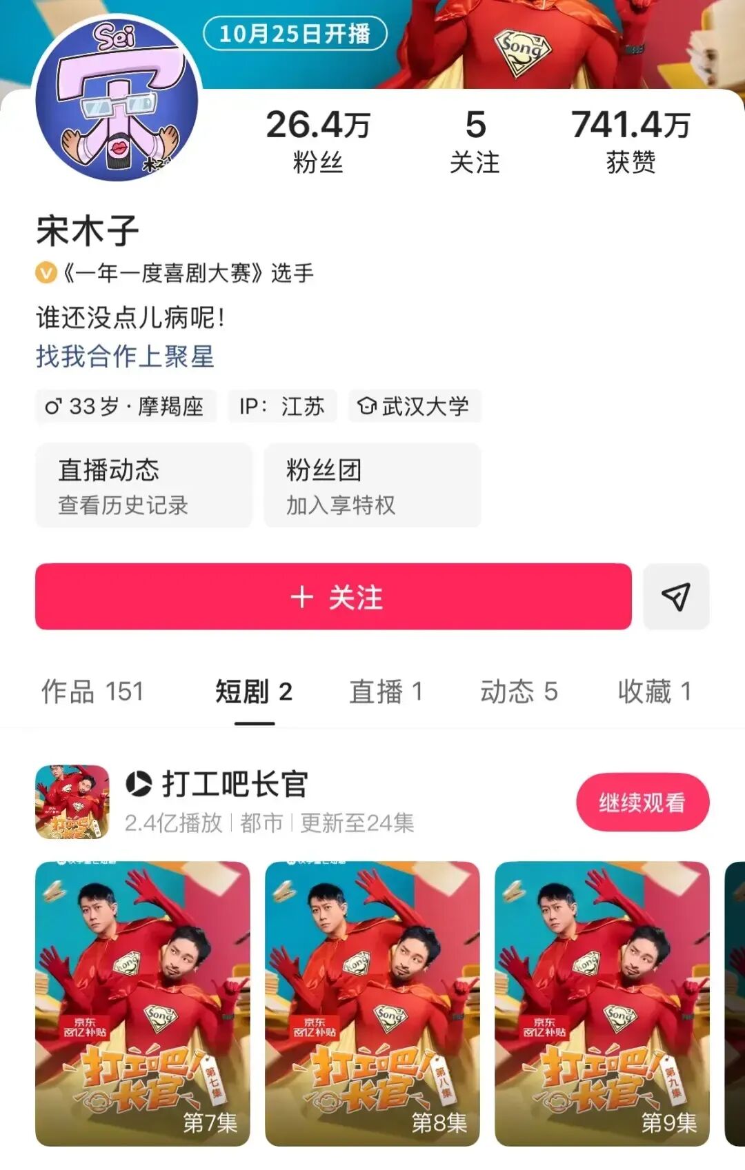 曾凭借一首《宋木子之歌》洗脑全网的喜剧演员宋木子,带着他的短剧《打工吧长官》走来了。