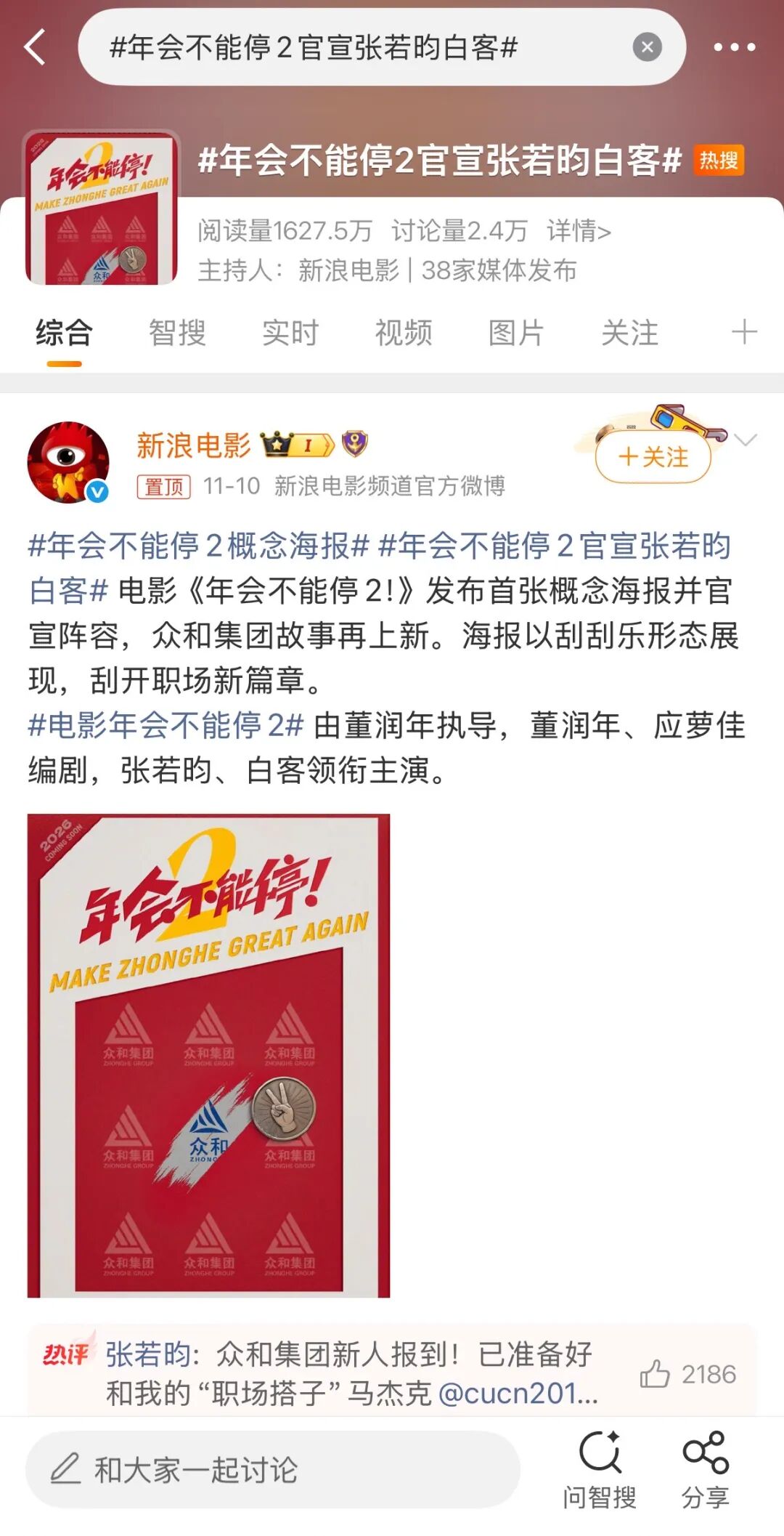 近期《年会不能停2》官宣阵容的消息,也在互联网上引发了一阵讨论,其主演从大鹏更换为张若昀的话题还登上了微博热搜榜。