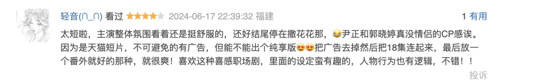 当时郭晓婷和尹正在短剧中的演技广受好评,还有一些网友在豆瓣评论这部剧的剧情有趣,表示自己喜欢看这类职场喜剧。