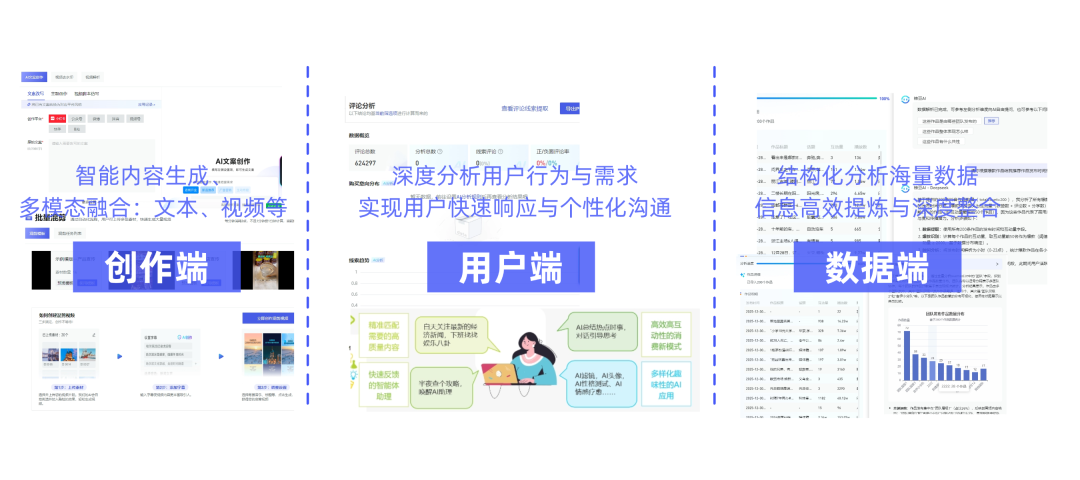 内容生产端,自动化水平持续提升,人机协同成为标配,多模态生成助力快速产出适配各平台的内容;用户互动端,推动互动革新,实现快速响应与个性化沟通;策略指导端,深度分析用户行为、预测需求变化,为内容创作提供方向;矩阵数据端,面对企业矩阵的庞大数据量,AI开始承担矩阵策略分析、智能数据解读等工作,赋能宏观层面的战略决策与洞察。